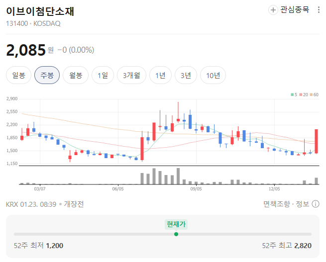 그래서 이브이첨단소재는 전형적인 실적주라기보다는, 특정 산업 이슈가 부각될 때마다 주가가 먼저 반응하는 스토리형 종목에 가깝습니다. 평소에는 비교적 조용하다가도, 전기차나 배터리, 최근에는 로봇·전고체 배터리 같은 키워드가 붙으면 단기간에 강하게 움직이는 흐름을 반복해 왔습니다.